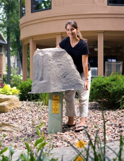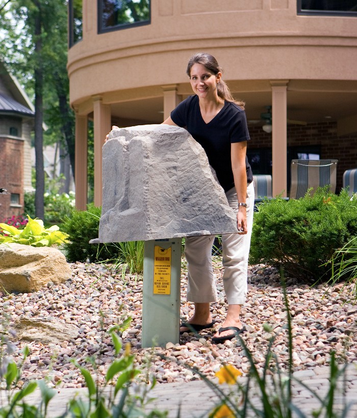 DekoRRa Products rock enclosures made with RealRock textured material. This gritty, tough, and variegated rock-like surface is astonishingly realistic, and blends in with other natural textures. All Dekorra rock enclosures are made in the USA from recyclable materials. RealRock offers incredibly realistic aesthetics and unmatched longevity in virtually any climate. The sturdy reinforced edge around the bottom of each Dekorrra rock adds weight and strength that can withstand 100 lbs per square foot. A patented flange design secures the enclosure to the ground. Heavy-duty stakes are included with each model. Artificial rock covers are available in a variety of colors.