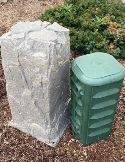 DekoRRa Products MockRock© rock enclosures are made with RealRock™ textured material. This gritty, tough, and variegated rock-like surface is astonishingly realistic and blends in with other natural textures. All Dekorra rock enclosures are made in the USA from recyclable materials. RealRock™ offers incredibly realistic aesthetics and unmatched longevity in virtually any climate. The sturdy reinforced edge around the bottom of each Dekorrra rock adds weight and strength that can withstand 100 lbs per square foot. A patented flange design secures the enclosure to the ground. Heavy-duty stakes are included with each model. Artificial rock covers are available in a variety of colors.