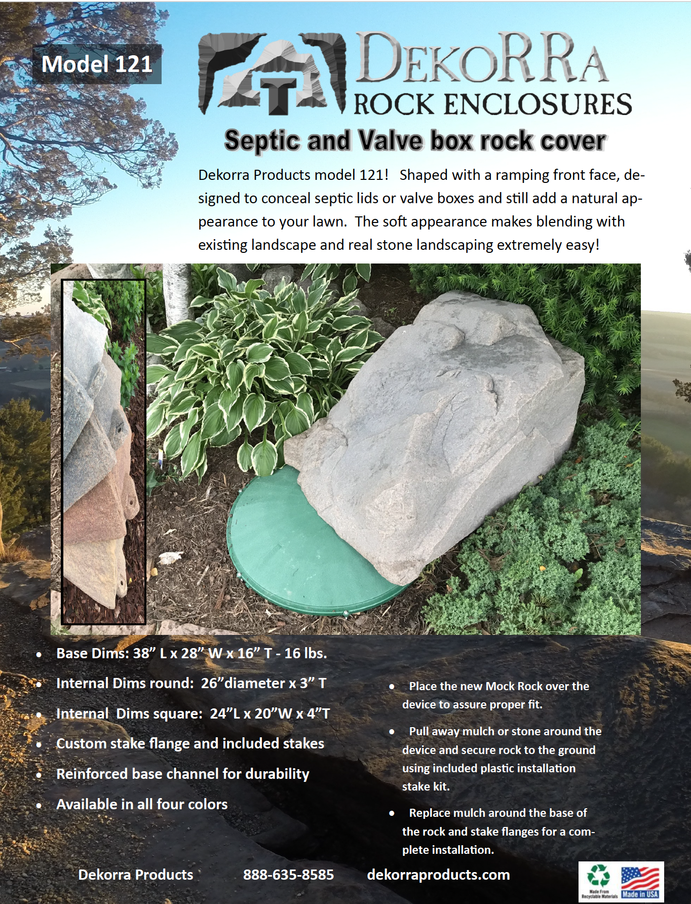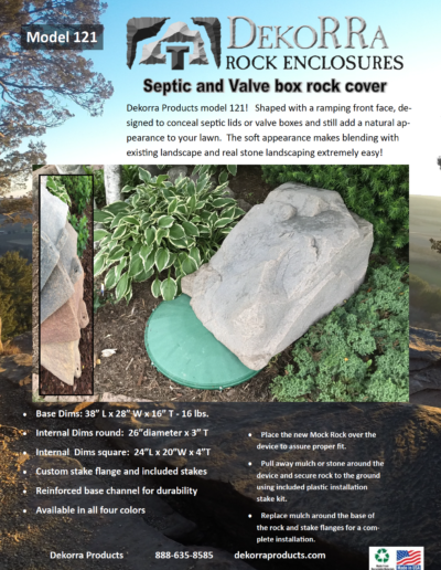 DekoRRa Products MockRock© rock enclosures are made with RealRock™ textured material. This gritty, tough, and variegated rock-like surface is astonishingly realistic and blends in with other natural textures. All Dekorra rock enclosures are made in the USA from recyclable materials. RealRock™ offers incredibly realistic aesthetics and unmatched longevity in virtually any climate. The sturdy reinforced edge around the bottom of each Dekorrra rock adds weight and strength that can withstand 100 lbs per square foot. A patented flange design secures the enclosure to the ground. Heavy-duty stakes are included with each model. Artificial rock covers are available in a variety of colors.